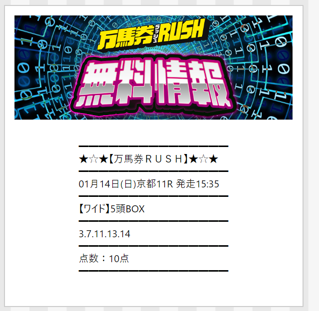 今月中旬の安定モード2日連続不的中会員だよ!過去の的中は2ヶ月無敗だったのに購入した途端に2日連続6鞍ゼンメツ〜。ここで購入=不的中連立方程式と未購入=的中連立方程式が成立しました〜。予想買い目がカスリもせんかった!自分未購入以降は的中しまくりっ!出来レースっ!!あ〜腹立つ!!!