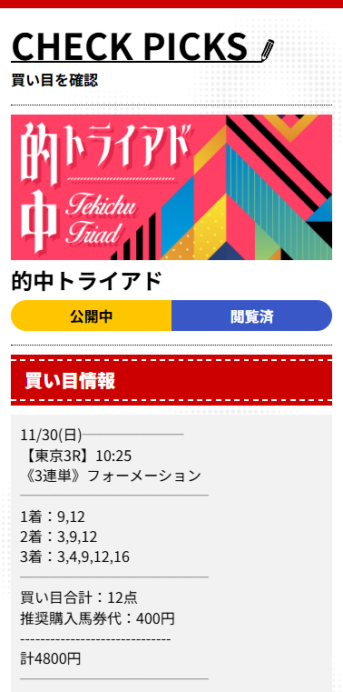 保育園で働いているんですが、園児のお昼寝中に見た東京3Rの結果で叫びそうになりました。9→3→12で3連単的中。4,800円が ¥51,400 に。大金じゃないけど、月末のしんどさが少し解消される“心の余裕”が生まれる額です。“三拍子そろった情報”という名に偽りなし。