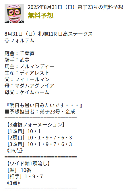 8月も後半戦から無料予想の調子が上がってきていたので